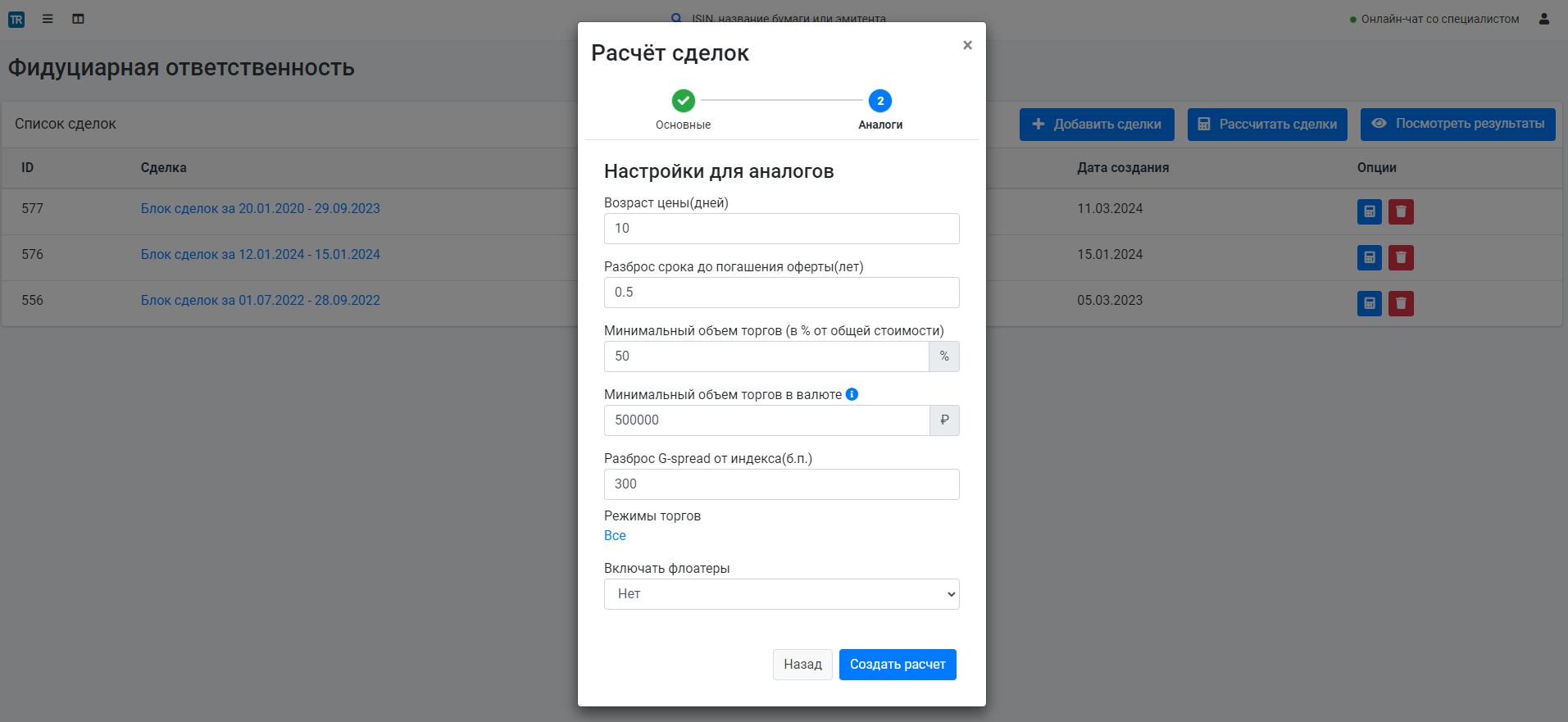 - Детальный анализ отдельной сделки после анализа блока сделок в меню "Фидуциарка". После расчета в меню "Фидуциарка", пользователь может перейти в меню калькулятора по отдельной сделке и посмотреть более детализированные результаты.